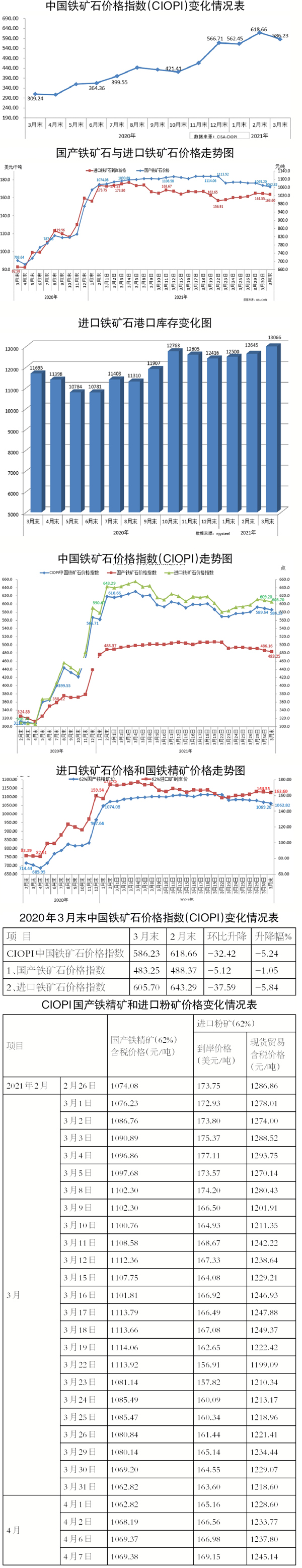 從全月情況看,3月份,CIOPI綜合指數平均值為597.86點,比2月份平均值上升12.76點,升幅為2.18%。其中,國產鐵礦石價格指數平均值為497.88點,比2月份平均值上升16.58點,升幅為3.44%;進口鐵礦石價格指數平均值為616.76點,比2月份平均值上升12.04點,升幅為1.99%。