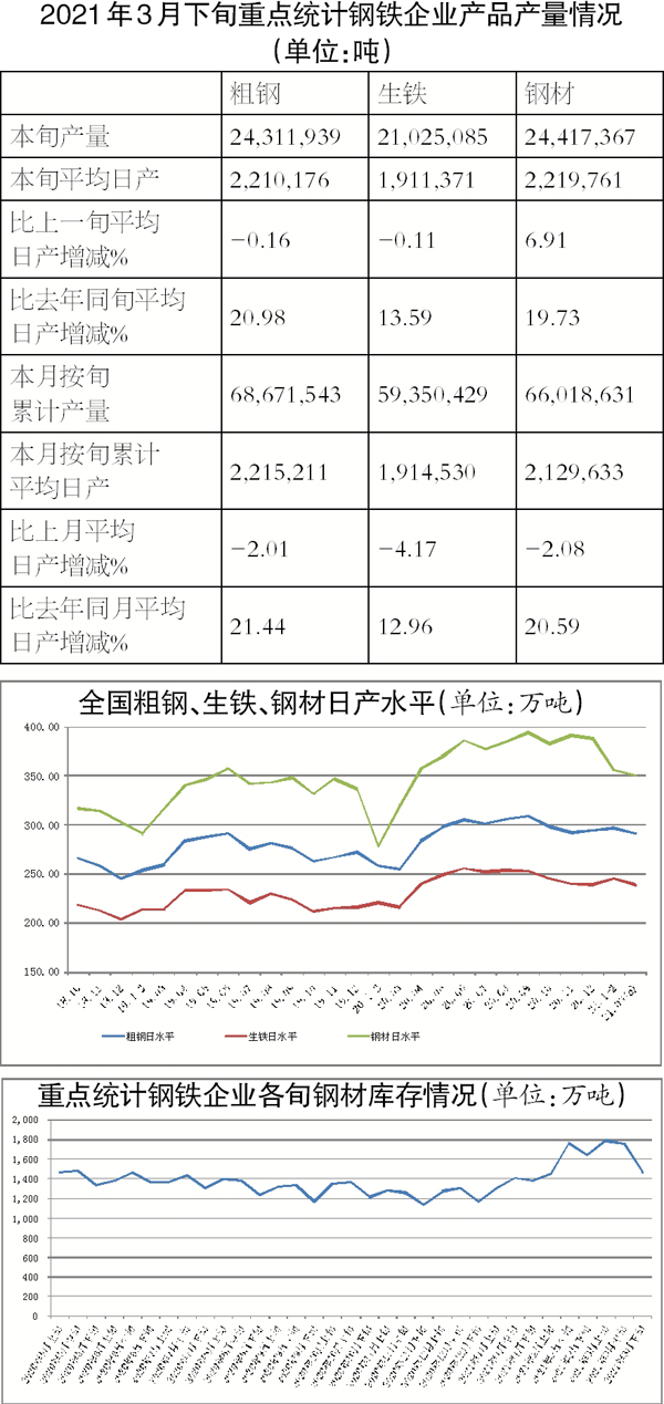 3月重點統計鋼鐵企業累計平均日產粗鋼221.52萬噸,環比下降2.01%、同比增長21.44%;生鐵191.45萬噸,環比下降4.17%、同比增長12.96%;鋼材212.96萬噸,環比下降2.08%、同比增長20.59%。
