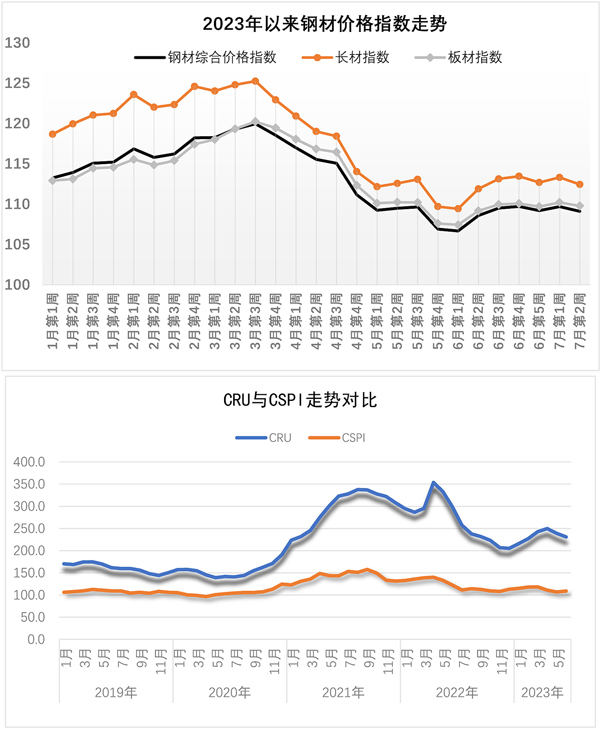 7月14日,中國鋼材價格指數(shù)(CSPI)為109.11點,比上月末下降0.08點,降幅為0.07%;比去年底下降4.14點,降幅為3.66%;同比下降4.10點,降幅為3.62%。其中,長材價格指數(shù)為112.44點,比上月末下降0.25點,降幅為0.22%;同比下降5.74點,降幅為4.86%。板材價格指數(shù)為109.79點,比上月末下降0.09點,降幅為0.08%;同比下降3.00點,降幅為2.66%。從同比數(shù)據(jù)來看,長材價格指數(shù)降幅大于板材價格指數(shù)降幅2.74個百分點。