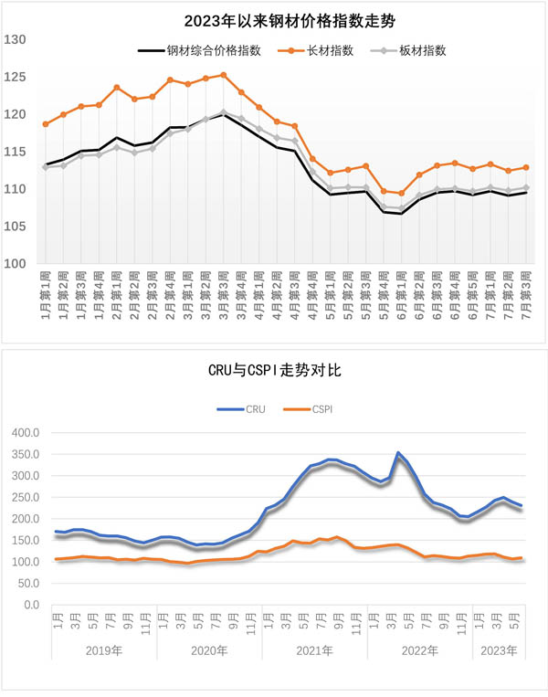 7月21日,中國鋼材價格指數(shù)(CSPI)為109.49點,周環(huán)比上漲0.38點,漲幅為0.35%;比上月末上漲0.30點,漲幅為0.27%;比去年底下降3.76點,降幅為3.32%;同比下降1.18點,降幅為1.07%。其中,長材價格指數(shù)為112.88點,周環(huán)比上漲0.44點,漲幅為0.39%;比上月末上漲0.19點,漲幅為0.17%;同比下降3.46點,降幅為2.97%。板材價格指數(shù)為110.18點,周環(huán)比上漲0.39點,漲幅為0.35%;比上月末上漲0.48點,漲幅為0.44%;同比上漲0.37點,漲幅為0.34%。