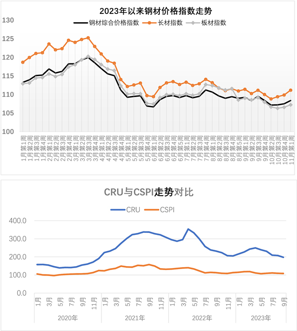 當(dāng)周,中國鋼材價格指數(shù)(CSPI)為108.37點,周環(huán)比增加0.87點,增幅為0.81%;比9月末上漲0.87點,漲幅為0.81%;比去年底下降4.88點,降幅為4.31%;同比增加1.45點,漲幅為1.36%。其中,長材價格指數(shù)為111.16點,周環(huán)比增加1.30點,增幅為1.18%;比9月末上漲1.30點,漲幅為0.18%;比去年底下降7.51點,降幅為6.33%;同比下降0.91點,降幅為0.81%。板材價格指數(shù)為107.23點,周環(huán)比上升0.66點,漲幅為0.62%;比9月末上漲0.66點,漲幅為0.62%;比去年底下降5.68點,降幅為5.03%;同比上升0.49點,漲幅為0.46%。