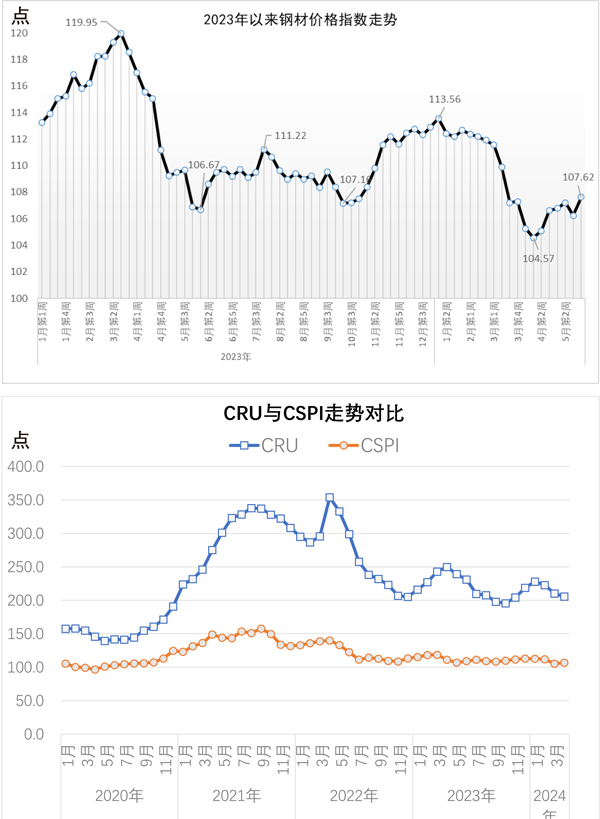 5月20日—5月24日當(dāng)周,國內(nèi)鋼材價格指數(shù)止跌上漲,長材價格指數(shù)、板材價格指數(shù)均有所上漲。