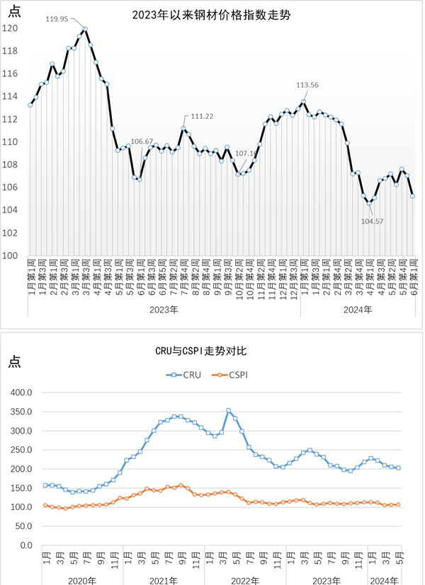 當(dāng)周,中國鋼材價(jià)格指數(shù)(CSPI)為105.24點(diǎn),周環(huán)比下降1.79點(diǎn),降幅為1.67%;比上月末下降1.79點(diǎn),降幅為1.67%;比去年底下降7.66點(diǎn),降幅為6.78%;同比下降1.43點(diǎn),降幅為1.34%。其中,長材價(jià)格指數(shù)為108.10點(diǎn),周環(huán)比下降2.81點(diǎn),降幅為2.54%;比上月末下降2.81點(diǎn),降幅為2.54%;比去年底下降8.01點(diǎn),降幅為6.90%;同比下降1.33點(diǎn),降幅為1.22%。板材價(jià)格指數(shù)為103.25點(diǎn),周環(huán)比下降1.26點(diǎn),降幅為1.20%;比上月末下降1.26點(diǎn),降幅為1.20%;比去年底下降8.55點(diǎn),降幅為7.65%;同比下降4.18點(diǎn),降幅為3.89%。