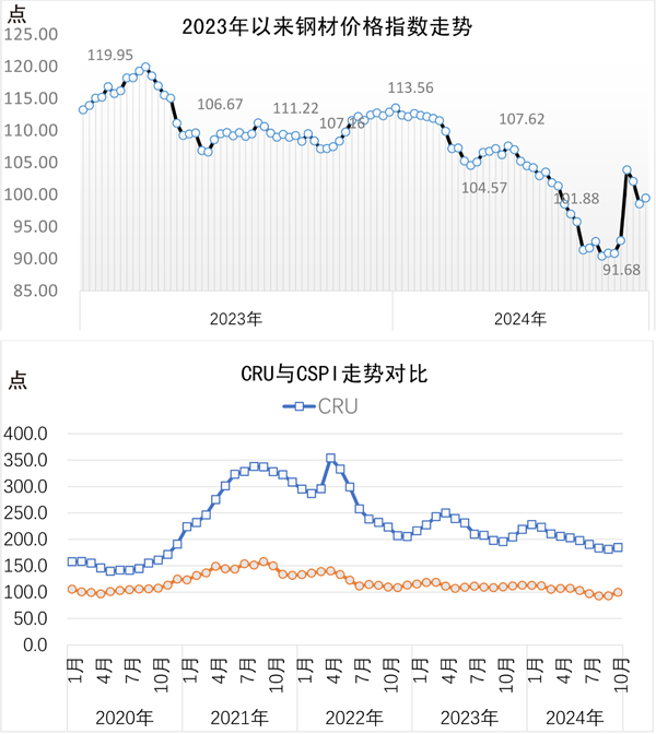 當周,中國鋼材價格指數(shù)(CSPI)為99.49點,周環(huán)比上漲0.92點,漲幅為0.93%;比9月末上漲6.64點,漲幅為7.15%;比去年底下降13.41點,降幅為11.88%;同比下降8.88點,降幅為8.19%。其中,長材價格指數(shù)為103.1點,周環(huán)比上漲0.82點,漲幅為0.80%;比9月末上漲5.33點,漲幅為5.45%;比去年底下降13.01點,降幅為11.20%;同比下降8.06點,降幅為7.25%。板材價格指數(shù)為96.78點,周環(huán)比上漲1.02點,漲幅為1.07%;比9月末上漲1.03點,漲幅為1.08%;比去年底下降15.02點,降幅為13.43%;同比下降10.45點,降幅為9.75%。