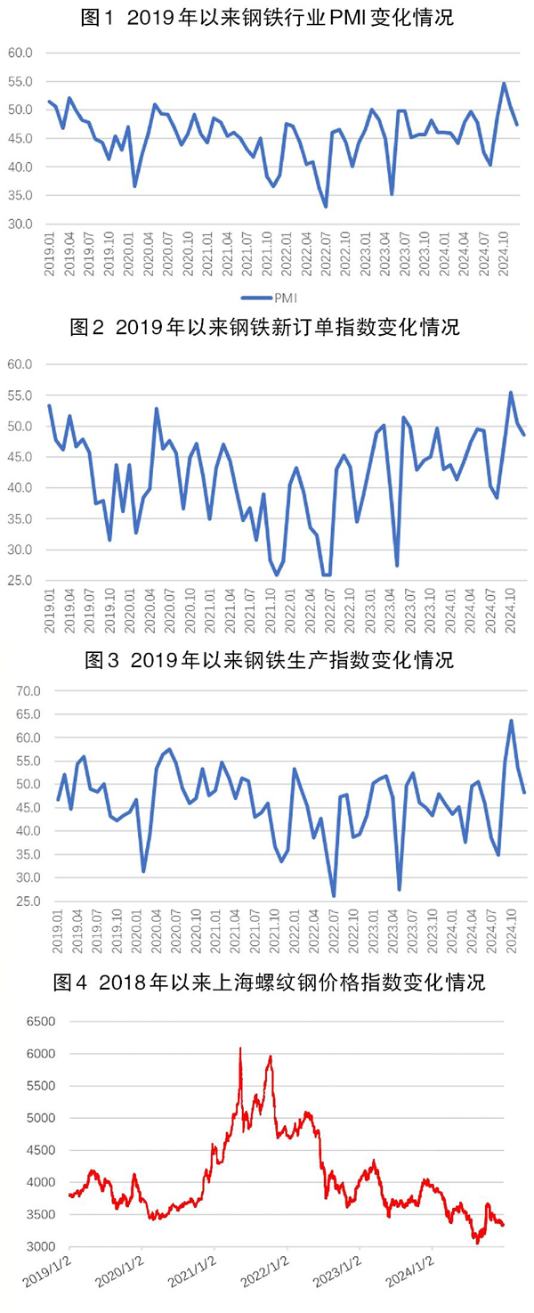 從中物聯鋼鐵物流專業委員會調查、發布的鋼鐵行業PMI(采購經理指數)來看,2024年12月份為47.5%,環比下降3.1個百分點,連續2個月運行在擴張區間后落入收縮區間,顯示鋼鐵行業進入傳統淡季。分項指數變化顯示,鋼材需求和鋼廠生產均有所收縮,原料價格繼續下滑,鋼材價格低位震蕩。2025年1月份,市場供需兩端將繼續收縮,原材料價格低位運行,鋼材價格微幅震蕩。