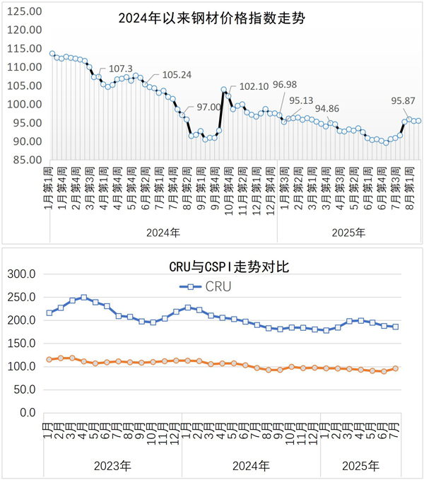 當周,中國鋼材價格指數(CSPI)為95.46點,周環比上漲0.07點,漲幅為0.07%;比上月末下降0.41點,降幅為0.43%;比去年底下降2.01點,降幅為2.06%;同比上漲4.08點,漲幅為4.46%。其中,長材價格指數為96.95點,周環比下降0.17點,降幅為0.18%;比上月末下降0.59點,降幅為0.60%;比去年底下降3.27點,降幅為3.26%;同比上漲3.37點,漲幅為3.60%。板材價格指數為94.23點,周環比上漲0.25點,漲幅為0.26%;比上月末下降0.27點,降幅為0.29%;比去年底下降1.32點,降幅為1.38%;同比上漲5.25點,漲幅為5.90%。