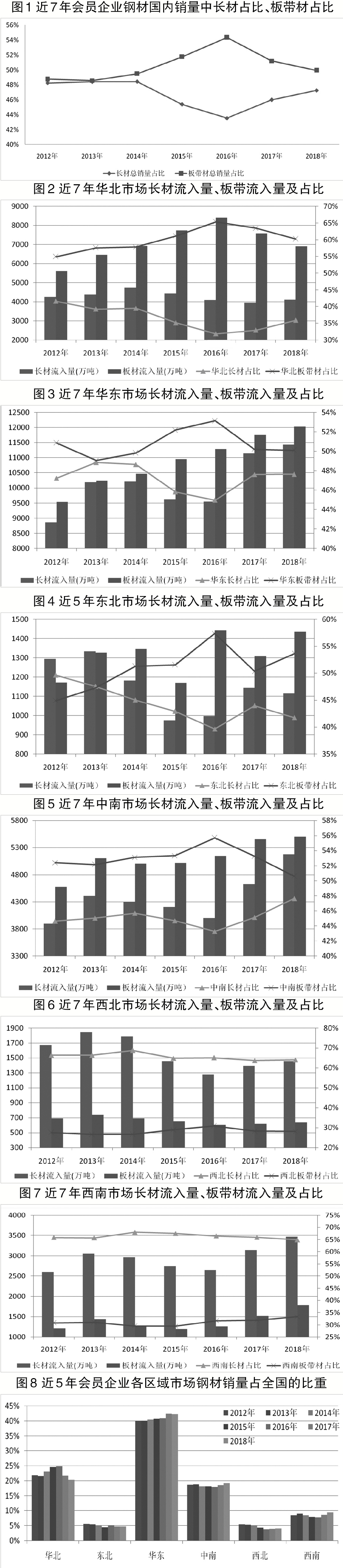 對6個區(qū)域市場的長材、板帶材占比進行對比分析可知:①西北市場、西南市場長材占比較高,2018年均保持在64%左右。其他4個區(qū)域市場長材占比均低于50%,但受徹底清除“地條鋼”的影響,這4個區(qū)域2018年長材流入量均出現(xiàn)增長,長材占比亦同比提高。西北市場、西南市場長材占比遠遠高于板帶材占比,表明固定資產投資對這兩個區(qū)域市場的鋼材消費總量及消費結構影響巨大。②華北市場2018年板帶材占比在6個區(qū)域市場中最高,而且是唯一一個板帶材占比連續(xù)4年(2015年~2018年)超過60%的區(qū)域市場,這主要與該區(qū)域內會員企業(yè)的產品結構有關,亦與營銷統(tǒng)計沒有涵蓋更多非會員企業(yè)(多以長材生產為主)的產品銷售情況有關。③華東市場、中南市場板帶材占比連續(xù)7年高于長材占比。華東市場前6年(2012年~2017年)長材占比始終高于中南市場,但2018年二者相等。中南市場近7年板帶材占比始終高于華東市場,但2018年二者差距僅為0.49個百分點,為近7年以來的最小差距。且這2個區(qū)域市場2017年、2018年鋼材流入量的增量都是由長材流入量的增長所拉動,即二者鋼材消費結構及供應結構有一定的相似性。④東北市場、西北市場鋼材流入量峰值均出現(xiàn)于2013年,但東北市場2018年鋼材流入量僅低于2013年,而西北市場鋼材流入量僅高于2015年、2016年、2017年,表明這2個市場雖然在前些年均出現(xiàn)了鋼材消費收縮的跡象,但東北市場的鋼材消費復蘇情況要略好于西北市場。