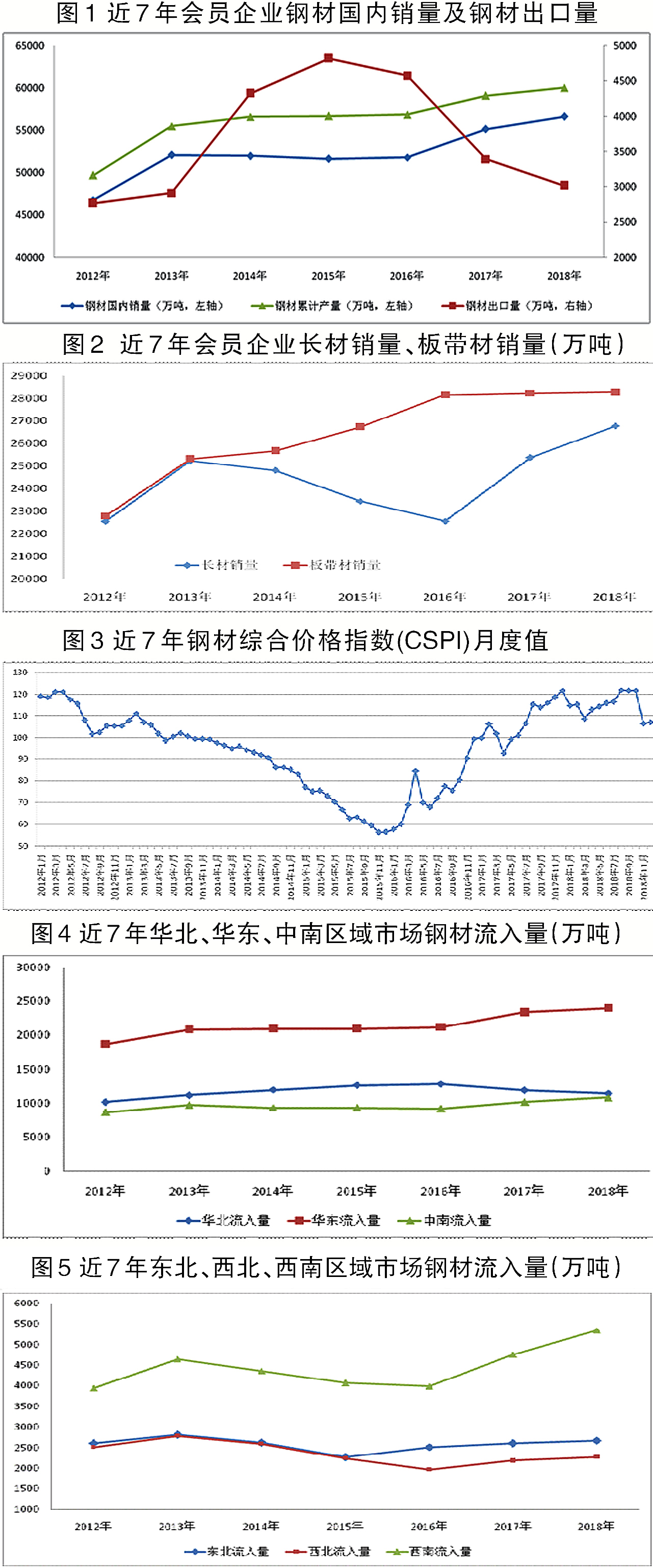 2017年、2018年會員企業(yè)鋼材產(chǎn)量、國內(nèi)銷量連續(xù)2年增長,其中,2018年會員企業(yè)生產(chǎn)鋼材60055.84萬噸,比2017年多生產(chǎn)957.07萬噸,增幅為1.62%;2018年鋼材國內(nèi)銷量為56646.21萬噸,較2017年增長了1493.38萬噸,增幅為2.71%。與此同時,會員企業(yè)鋼材出口量連續(xù)2年下降,2017年出口量下降了1183.88萬噸,2018年出口量下降了376.05萬噸,其中2018年鋼材出口量降至3017.26萬噸,僅略高于2012年、2013年。上述數(shù)據(jù)表明,會員企業(yè)近2年增產(chǎn)的鋼材以及受鋼材出口量下降影響轉(zhuǎn)為國內(nèi)市場供應增量的鋼材,都在國內(nèi)市場得到了很好的消化。
