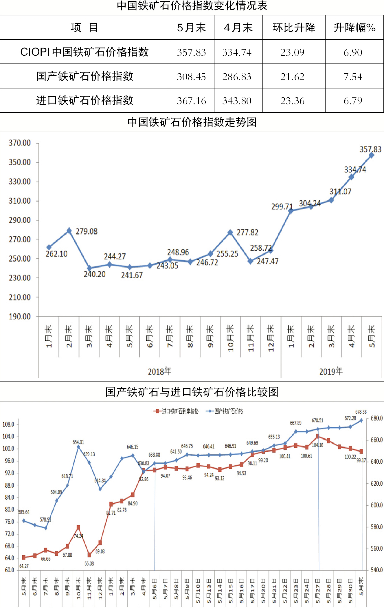 據(jù)中國鋼鐵工業(yè)協(xié)會監(jiān)測,5月末,中國鐵礦石價格指數(shù)(CIOPI)為357.83點,環(huán)比上升23.09點,升幅為6.90%。其中,國產(chǎn)鐵礦石價格指數(shù)為308.45點,環(huán)比上升21.62點,升幅為7.54%;進(jìn)口鐵礦石價格指數(shù)為367.16點,環(huán)比上升23.36點,升幅為6.79%。