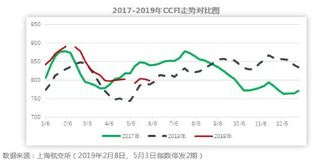 5月受中美貿(mào)易戰(zhàn)升級(jí)威脅,市場(chǎng)回升受阻。CCFI均值799點(diǎn),環(huán)比減少0.1%,同比上漲3.7%。分航線看,亞歐線指數(shù)基本持平,歐洲和地中海線環(huán)比上漲0.4%和下跌0.7%;跨太平洋航線上漲,美西和美東線指數(shù)環(huán)比上漲4.8%和6.6%;亞洲航線指數(shù)下滑,日本、韓國(guó)和東南亞線環(huán)比下降1%、2.6和3.2%;南北航線普遍下跌,澳新、南非、南美和東西非線環(huán)比下滑6.9%、4.6%、6.7%和0.8%;此外,波紅線指數(shù)環(huán)比減少7.9%。1至5月CCFI均值831點(diǎn),同比上漲4.6%。5月,SCFI均值747點(diǎn),環(huán)比減少4%,同比減少2.8%;1至5月,SCFI均值820點(diǎn),同比增長(zhǎng)6.7%。