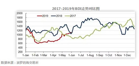 5月市場(chǎng)持續(xù)攀升。國(guó)際鐵礦石市場(chǎng)走高,價(jià)格穩(wěn)步上升,5月7日突破100美元/噸,觸及近五年的高位,礦商發(fā)貨意愿增強(qiáng),澳大利亞鐵礦石出口強(qiáng)勢(shì)回升,巴西長(zhǎng)航線回暖,帶動(dòng)市場(chǎng)反彈攀高。大西洋糧食貿(mào)易穩(wěn)定,對(duì)市場(chǎng)起到支撐作用。BDI月底收?qǐng)?bào)1096點(diǎn),為1月20日以來(lái)的最高點(diǎn)。5月BDI均值1036點(diǎn),環(huán)比上漲34.0%%,同比下跌19.9%。1至5月BDI均值841點(diǎn),同比下跌29.3%。截至5月27日,2019年干散貨船新增運(yùn)力146艘、1337.8萬(wàn)載重噸,拆解39艘、430.0萬(wàn)載重噸;運(yùn)力凈增107艘、907.8萬(wàn)載重噸,增速仍保持在同期相對(duì)低位水平。