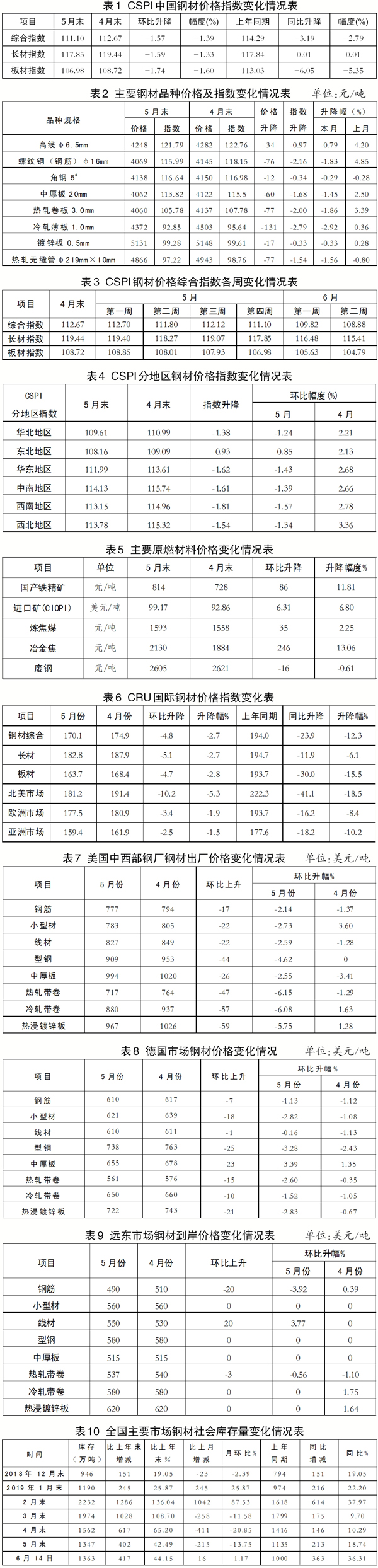 主要區(qū)域市場鋼材價格變化情況。據(jù)鋼協(xié)監(jiān)測,5月份,CSPI全國六大區(qū)域市場價格指數(shù)均由升轉(zhuǎn)降。其中,西南地區(qū)價格指數(shù)降幅較大,環(huán)比下降1.57%;東北地區(qū)價格指數(shù)降幅較小,環(huán)比下降0.85%;華北、華東、中南和西北地區(qū)價格指數(shù)環(huán)比分別下降1.24%、1.43%、1.39%和2.78%。(見表4)