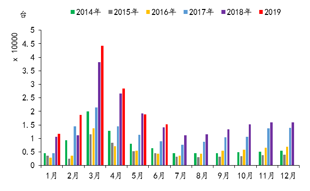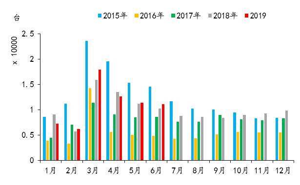 據中國工程機械工業協會統計,2019年6月納入統計的25家挖掘機制造企業共銷售各類挖掘機15121臺,同比增長6.58%。國內市場銷量12426臺,同比下降0.31%。出口2695臺,同比增長56.4%。1-6月累計總銷量137207臺,同比增長14.2%;累計內銷124872臺,同比增長12.3%;累計出口12335臺,同比增長38.7%。在經過5月份的短暫回落之后,6月挖掘機銷量恢復正增長, 5月份負增長主要與3方面因素有關,一是一季度銷量超預期,透支了二季度需求,二是2018年同期的基數較高,三是存量老舊設備的更換需求減弱。