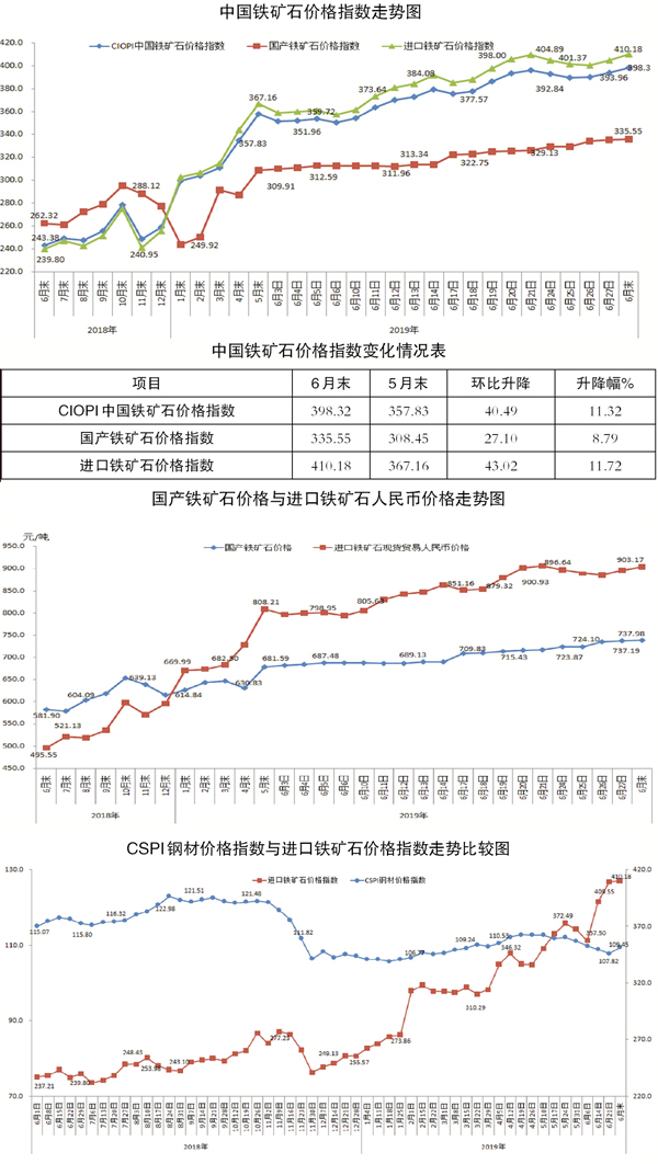據中國鋼鐵工業協會監測,6月末,中國鐵礦石價格指數(CIOPI)為398.32點,環比上升40.49點,升幅為11.32%。其中,國產鐵礦石價格指數為335.55點,環比上升27.10點,升幅為8.79%;進口鐵礦石價格指數為410.18點,環比上升43.02點,升幅為11.72%。