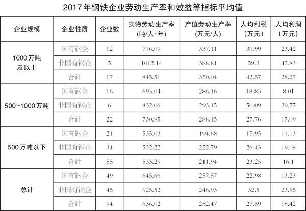 從中國鋼鐵工業(yè)協(xié)會的統(tǒng)計數(shù)據(jù)分析來看,2017年,國有鋼企的粗鋼產(chǎn)量規(guī)模、實物勞動生產(chǎn)率、產(chǎn)值勞動生產(chǎn)率平均值均大于非國有鋼企,人均利稅、人均利潤平均值均小于非國有鋼企;粗鋼產(chǎn)量在1000萬噸及以上的大型鋼企的實物勞動生產(chǎn)率為845.51噸/人·年,高于中小企業(yè)的實物勞動生產(chǎn)率水平。