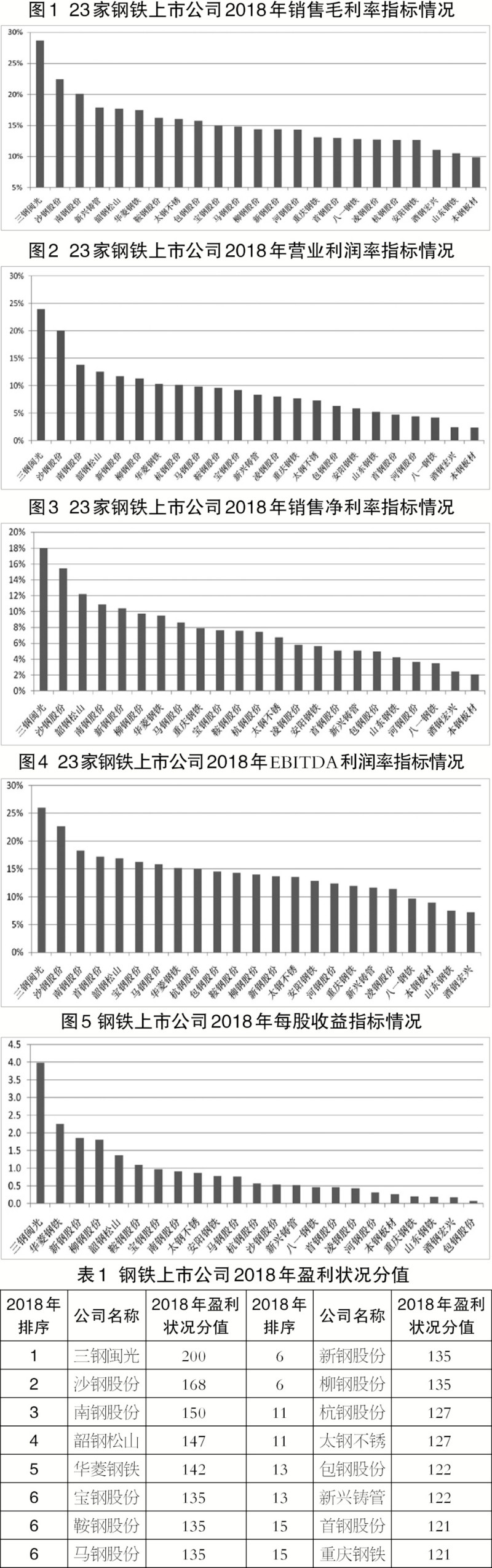盈利能力是指企業獲取利潤的能力。本文基于財務指標的可比性、一致性原則,結合鋼鐵行業的運行特點,突出了23家鋼鐵上市公司(以鋼鐵長流程生產工藝為主)在盈利結構及盈利質量方面的對比分析,并據此在盈利能力評估上選取了銷售毛利率、銷售凈利率、營業利潤率、EBITDA(息稅折舊攤銷前利潤)利潤率、每股基本收益等5項指標。在對23家上市公司各項盈利指標情況進行對比分析的基礎上,運用相關數學模型計算出各上市公司2018年盈利狀況分值,以綜合評價各上市公司盈利狀況的優劣。