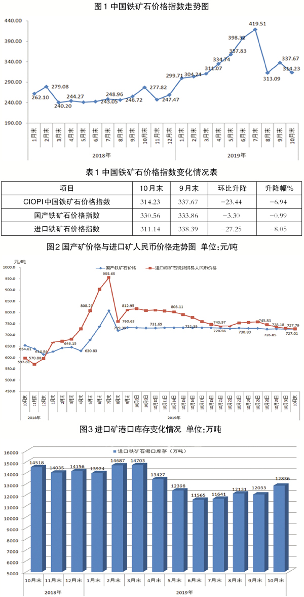 據(jù)中國(guó)鋼鐵工業(yè)協(xié)會(huì)監(jiān)測(cè),10月末,中國(guó)鐵礦石價(jià)格指數(shù)(CIOPI)為314.23點(diǎn),環(huán)比下降23.44點(diǎn),降幅為6.94%,環(huán)比由升轉(zhuǎn)降。其中,國(guó)產(chǎn)鐵礦石價(jià)格指數(shù)為330.56點(diǎn),環(huán)比下降3.30點(diǎn),降幅為0.99%;進(jìn)口鐵礦石價(jià)格指數(shù)為311.14點(diǎn),環(huán)比下降27.25點(diǎn),降幅為8.05%。