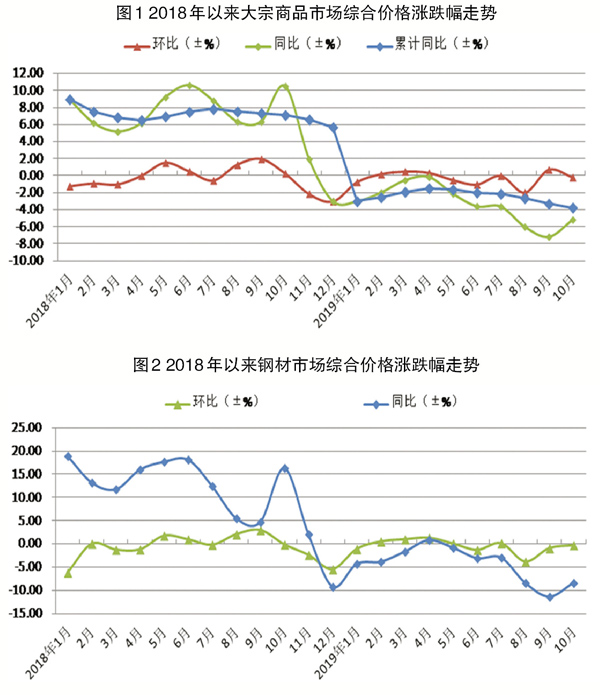 10月份,受需求旺季的影響,國內大宗商品市場形勢繼續向好,行業經營狀況有所好轉。不過,由于國內宏觀經濟下行壓力仍在加大、國際貿易局勢仍不穩定,大宗商品市場回暖的力度不及往年同期。大宗商品供應端的增速明顯快于需求端,導致市場供給壓力加大,庫存持續增長,市場價格未能延續9月份的回升走勢。10月份,大宗商品市場價格環比下跌0.2%,同比下跌5.2%。1月~10月份,大宗商品市場累計平均價格同比下降3.7%,降幅比1月~9月份擴大0.4個百分點。