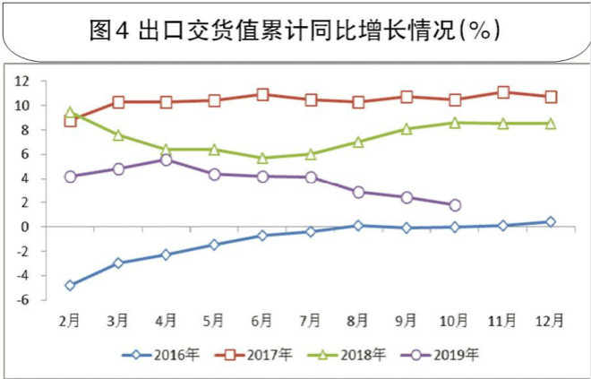 10月份,我國出口交貨值1.09萬億元,同比下降3.80%(去年同期為同比增長14.70%),降幅環比擴大3.10個百分點。這與通信設備、計算機及其他電子設備制造業受中美貿易摩擦影響出口交貨值增速由正轉負有關。自8月份以來,出口交貨值同比增速一直處在負增長區間,導致出口交貨值累計同比增速連續回落。1月~10月份,我國出口交貨值累計達到10.11萬億元,同比增長1.80%,增速比去年同期大幅回落6.80個百分點,比前三季度回落0.60個百分點,且有進一步回落的可能。