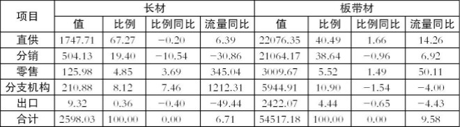 表2 1月~8月份重點鋼企長材、板帶材銷售渠道情況表(單位:萬噸,%)