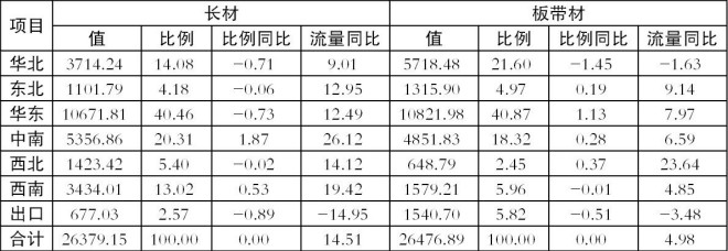 表1 1月~10月份重點鋼鐵企業(yè)長材、板帶材區(qū)域流量(單位:萬噸 %)