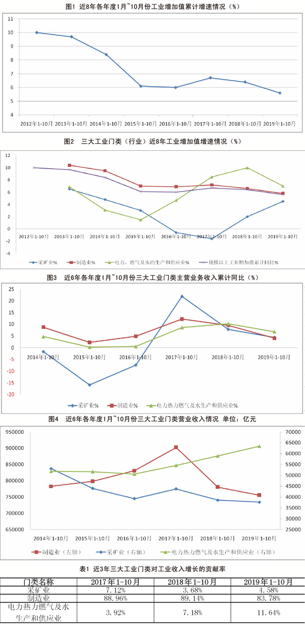 2019年1月~10月份,采礦業主營業務收入(下同)為3.77萬億元,同比增長4.4%,較2018年同期增速回落3.4個百分點;制造業收入為75.55萬億元,同比增長4%,較2018年同期增速回落5.5個百分點;電力熱力燃氣及水生產和供應業收入為6.34萬億元,同比增長6.8%,較2018年同期增速回落3.4個百分點。電力熱力燃氣及水生產和供應業收入增速雖然出現回落,但依然高于其他2個門類。