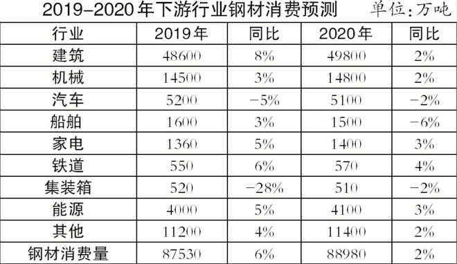 2020年鋼鐵主要下游行業(yè)表現(xiàn)預(yù)計(jì)會(huì)繼續(xù)分化。其中,基礎(chǔ)設(shè)施建設(shè)投資將加碼,房地產(chǎn)行業(yè)投資、新開工面積增速可能放緩,家電行業(yè)保持平穩(wěn)增長(zhǎng),汽車、船舶、集裝箱和機(jī)械行業(yè)的部分子行業(yè)可能出現(xiàn)負(fù)增長(zhǎng)。但總體而言,鋼材需求量預(yù)計(jì)整體小幅增長(zhǎng),達(dá)到8.9億噸,同比增長(zhǎng)2%。