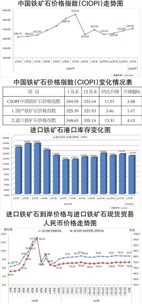 從全月情況看,1月份CIOPI綜合指數平均值為342.28點,較2019年12月份上升11.40點,升幅為3.45%。其中,國產鐵礦石價格指數平均值為323.48點,比2019年12月份上升1.89點,升幅為0.59%;進口鐵礦石價格指數平均值為345.83點,比2019年12月份上升13.19點,升幅為3.97%。
