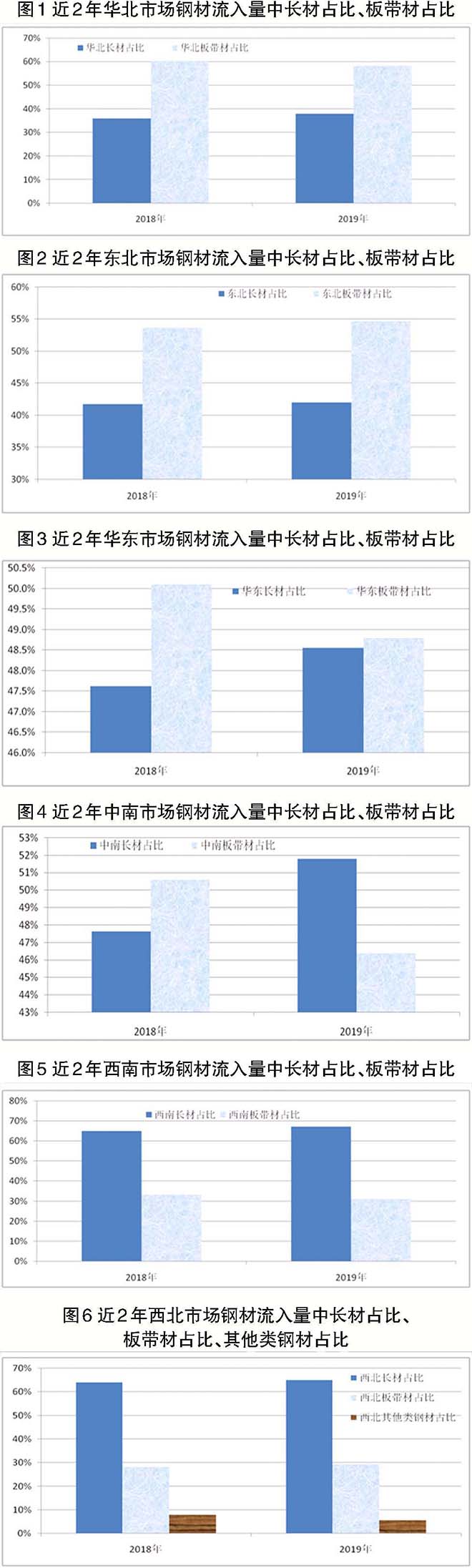 6個(gè)區(qū)域市場的長材流入量與2018年名義比較均是正增長;僅華北市場板帶材流入量較2018年出現(xiàn)了下降,其他5個(gè)區(qū)域市場板帶材流入量與2018年名義比較亦是正增長;僅東北市場、西北市場的其他類鋼材流入量較2018年出現(xiàn)下降,其他4個(gè)區(qū)域市場其他類鋼材流入量較2018年名義比較均為正增長。因此,各區(qū)域市場鋼材流入量中長材占比、板帶材占比、其他類鋼材占比能否出現(xiàn)增長,更多取決于這3類鋼材流入量的增幅能否大于整個(gè)鋼材流入量的增幅。