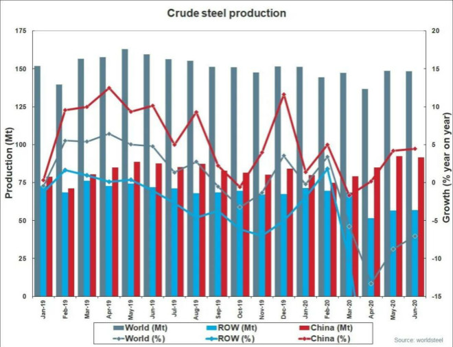 2020年6月,美國粗鋼產量為470萬噸,同比下降34.5%。