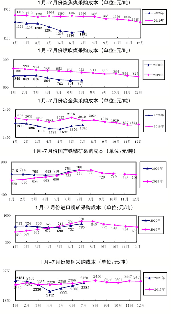 1月~7月份,煉焦煤累計(jì)采購(gòu)成本同比下降11.19%;冶金焦同比下降11.31%;國(guó)產(chǎn)鐵精礦同比升高5.87%,進(jìn)口粉礦同比升高3.87%;廢鋼同比下降2.15%。