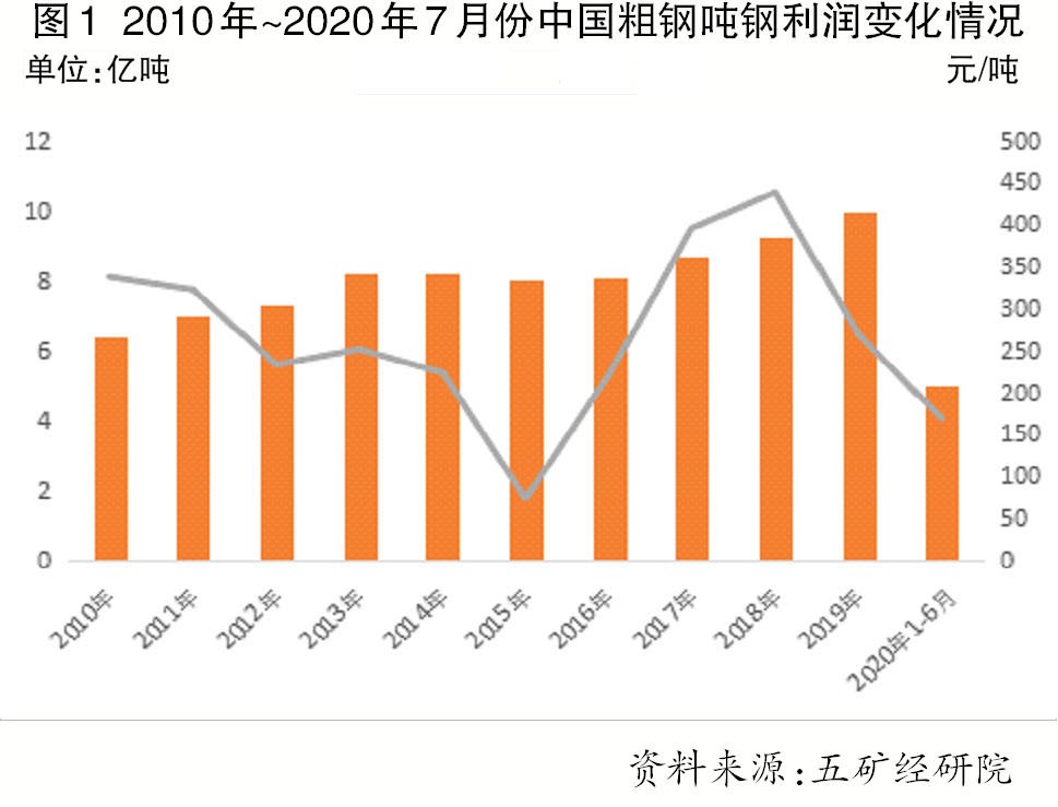 從噸鋼利潤來看,根據國家統計局公布的數據,1月~7月份我國黑色金屬冶煉及壓延加工業利潤總計1106.9億元,同比下降32%。按前7個月中國粗鋼產量5.93億噸計算,前7個月我國粗鋼噸鋼利潤僅為186元(見圖1),為自2010年以來的行業次低點,僅高于2015年“鋼鐵寒冬”時的水平。這就是中國鋼鐵工業目前面臨的尷尬現象:產量逐年攀升,而利潤水平逐年下行。