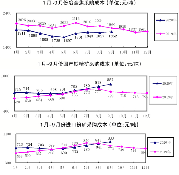 9月份,對標企業進口粉礦加權平均采購成本為887.73元/噸,環比升高47.20元/噸,升幅為5.62%。1月~9月份,累計平均采購成本為751.04元/噸,同比升高33.35元/噸,升幅為4.65%。