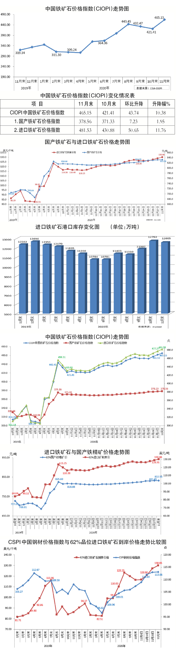 據(jù)鋼協(xié)監(jiān)測(cè),11月末,中國(guó)鐵礦石價(jià)格指數(shù)(CIOPI)為465.15點(diǎn),環(huán)比上升43.74點(diǎn),升幅為10.38%,環(huán)比由降轉(zhuǎn)升。