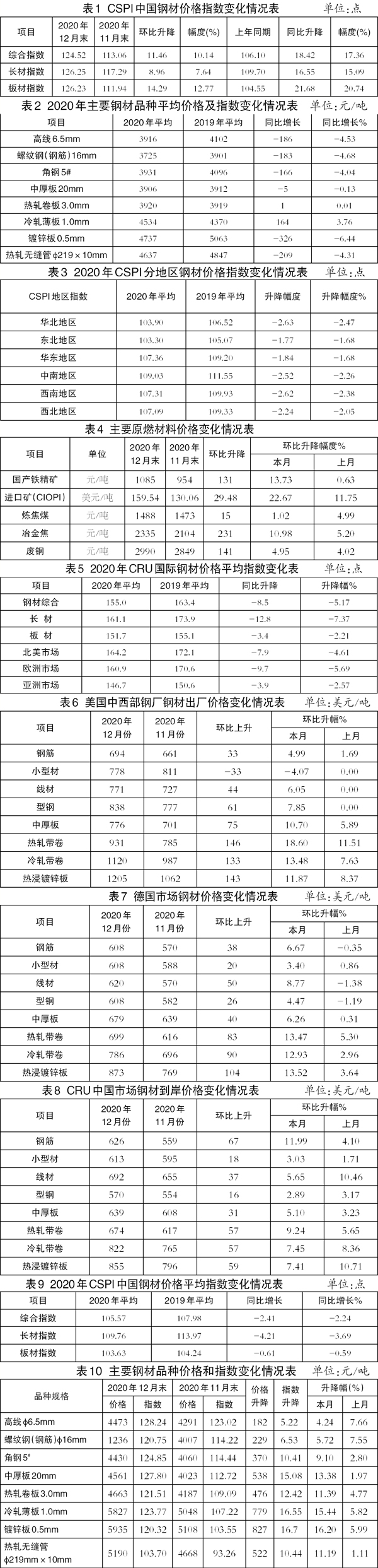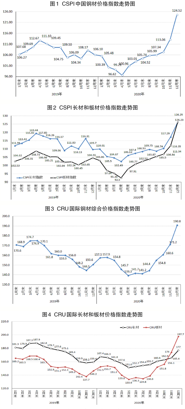 從全年情況看,2020年CSPI國內鋼材價格指數平均值為105.57點,同比下降2.41點,降幅為2.24%。其中,1月~4月份呈下行走勢,5月~12月份持續上升,特別是11月~12月份升幅較大。