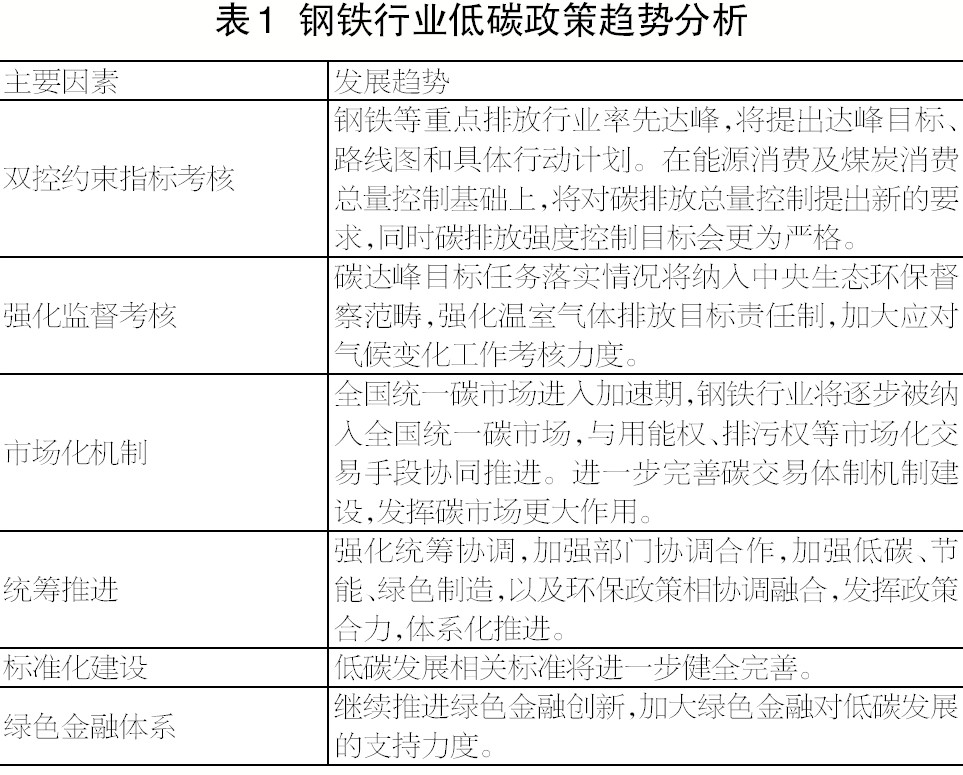 結合現階段國家形勢發展要求分析,預判鋼鐵行業低碳政策發展將呈現以下特征,如表1所示。