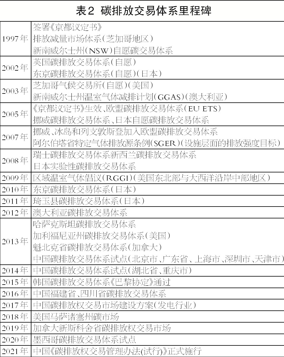 1997年12月,在《聯合國氣候變化框架公約》基礎上形成的《京都議定書》,第一次將溫室氣體減排提升到國際法律層面上,創新性地通過引入市場機制來解決“全球氣候”這種稀缺性“公共物品”的優化配置問題。目前,全球范圍內約有21個碳交易體系在29個轄區生效,占全球國內生產總值的42%,全球溫室氣體排放量的9%由這些體系覆蓋。同時,另外有24個國家政府正在考慮建立碳交易體系以實現氣候目標。應該說,碳交易已經成為全球應對氣候變化的主要手段。見表2。