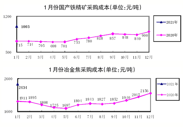 1月份,主要原燃料采購成本環(huán)比全面上升,焦炭和鐵礦石采購成本升幅在10%以上。