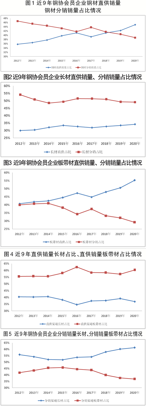 總體來看,鋼協會員企業2020年鋼材直供銷量占比創歷史新高,較近9年來的歷史低點(2012年)高出了9.2個百分點;2020年鋼材分銷銷量占比創歷史新低,較近9年來的歷史高點(2012年)下降了7.78個百分點。這一現象表明,鋼鐵企業與下游鋼材用戶之間的緊密度在加強,鋼鐵企業正在從鋼材生產商向鋼材綜合服務商轉變。