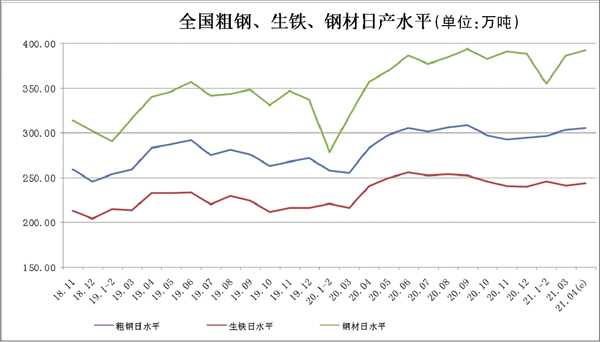 4月重點統計鋼鐵企業累計日均產粗鋼232.40萬噸,環比增長4.91%,同比增長19.68%;日均產生鐵197.65萬噸,環比增長3.24%,同比增長11.20%;日均產鋼材225.23萬噸,環比增長5.76%,同比增長19.36%。
