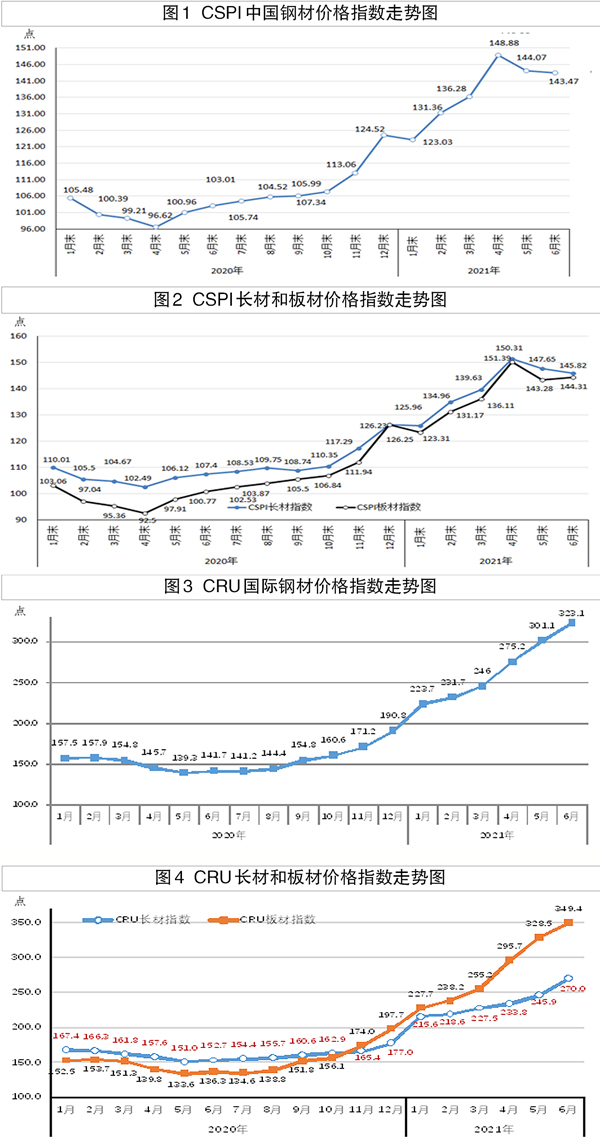 從上半年分月情況看,CRU鋼價指數呈逐月上升走勢。1月~6月份平均值為266.8點,同比上升117.3點,升幅為78.5%,高于國內鋼價升幅41.9個百分點。