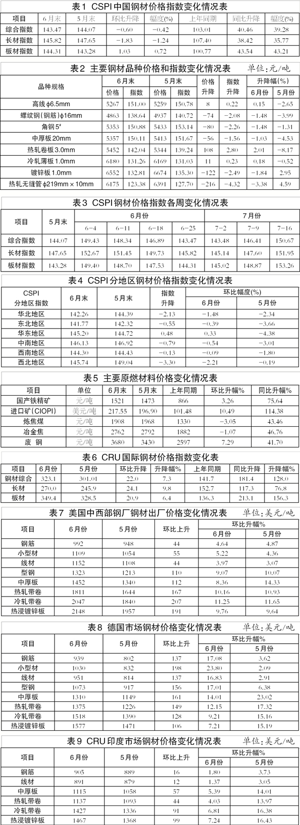 據鋼協監測,6月末,中國鋼材價格指數(CSPI)為143.47點,比5月末下降0.60點,降幅為0.42%,較5月份收窄2.81個百分點;同比上升40.46點,升幅為39.28%。(見圖1)