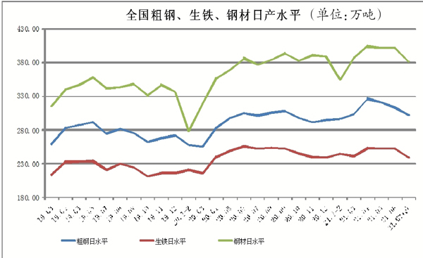 根據(jù)重點(diǎn)統(tǒng)計(jì)鋼鐵企業(yè)產(chǎn)量估算,7月中旬全國(guó)共生產(chǎn)粗鋼3051.22萬(wàn)噸,日產(chǎn)粗鋼305.12萬(wàn)噸、環(huán)比增長(zhǎng)2.09%、同比增長(zhǎng)2.36%;生產(chǎn)生鐵2419.31萬(wàn)噸,日產(chǎn)生鐵241.93萬(wàn)噸、環(huán)比增長(zhǎng)2.18%、同比下降3.64%;生產(chǎn)鋼材3911.53萬(wàn)噸,日產(chǎn)鋼材391.15萬(wàn)噸、環(huán)比增長(zhǎng)5.02%、同比增長(zhǎng)6.49%。7月中上旬累計(jì)平均日產(chǎn)量,全國(guó)粗鋼環(huán)比下降5.39%,同比增長(zhǎng)0.01%;生鐵環(huán)比下降4.46%,同比下降0.16%;鋼材環(huán)比下降3.99%,同比增長(zhǎng)0.04%。