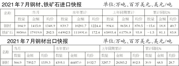 根據海關統計快訊數據,7月份,我國出口鋼材566.9萬噸,環比減少78.9萬噸,下降12.2%;均價為1339.3美元/噸,環比上升55.9美元/噸,提高4.4%。1月~7月份,累計出口鋼材4305.1萬噸,同比增加1017.4萬噸,增長30.9%。