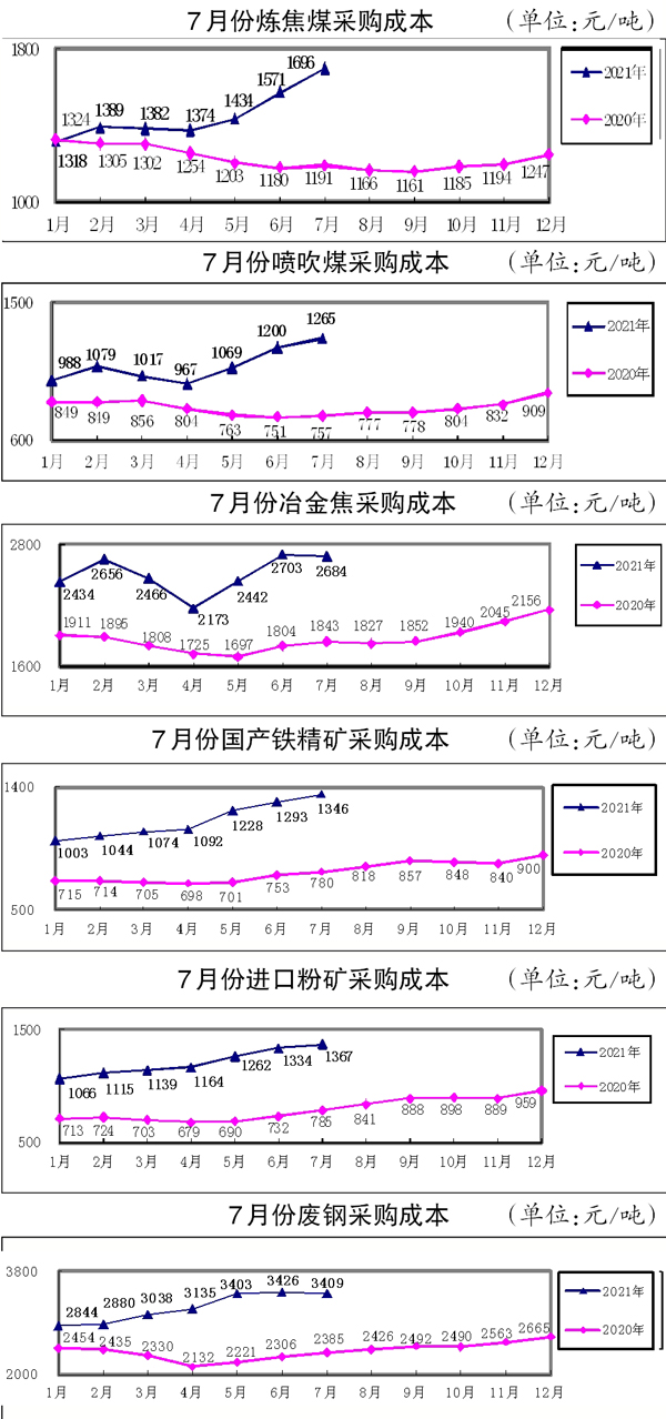 1月~7月份,煉焦煤累計采購成本同比增長16.43%;冶金焦同比增長39.02%;國產鐵精礦同比增長60.37%,進口粉礦同比增長68.48%;廢鋼同比增長37.91%。