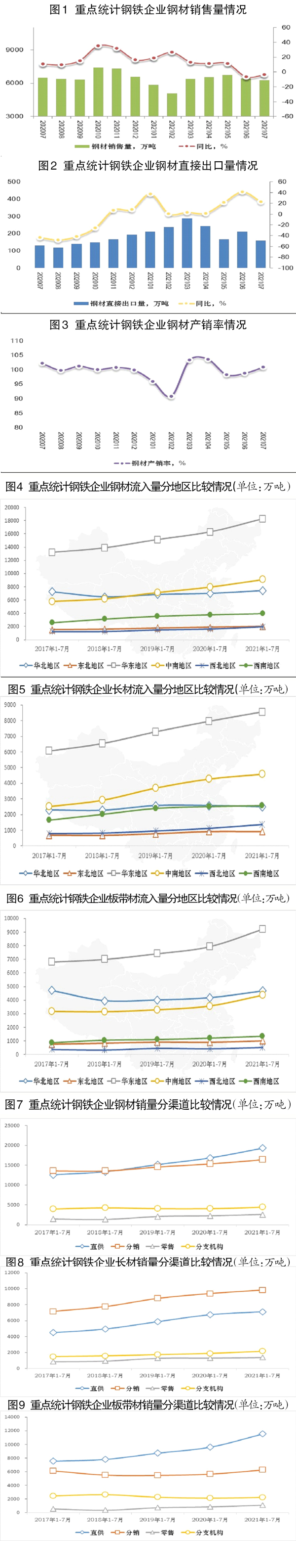 分銷售渠道看,1月~7月份,重點統(tǒng)計鋼鐵企業(yè)同2020年1月~7月份相比,鋼材直供銷量增長幅度最大。其中板帶材直供銷量大幅上升,且上升幅度高于整個鋼材直供銷量的上升幅度,表明重點統(tǒng)計鋼鐵企業(yè)加強了對板帶材用戶的服務(wù)力度,進一步擴大了板帶材直供渠道。