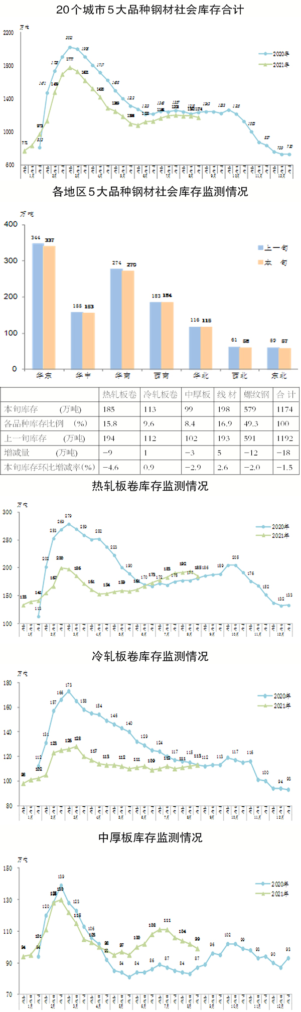 8月下旬,分地區(qū)來看,七大區(qū)域鋼材社會(huì)庫存除西南地區(qū)略有上升外,其他地區(qū)均有不同程度下降。具體情況為:華東地區(qū)環(huán)比減少7萬噸,下降2.0%;華南地區(qū)減少4萬噸,下降1.5%;西北地區(qū)減少3萬噸,下降4.9%;華中地區(qū)減少2萬噸,下降1.3%;東北地區(qū)減少2萬噸,下降3.4%;華北減少1萬噸,下降0.9%;西南地區(qū)增加1萬噸,上升0.5%。