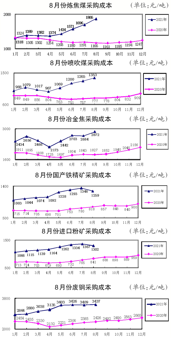 1月~8月份,煉焦煤累計(jì)采購(gòu)成本同比增長(zhǎng)21.65%;冶金焦同比增長(zhǎng)40.66%;國(guó)產(chǎn)鐵精礦同比增長(zhǎng)58.79%,進(jìn)口粉礦同比增長(zhǎng)66.44%;廢鋼同比增長(zhǎng)37.94%。