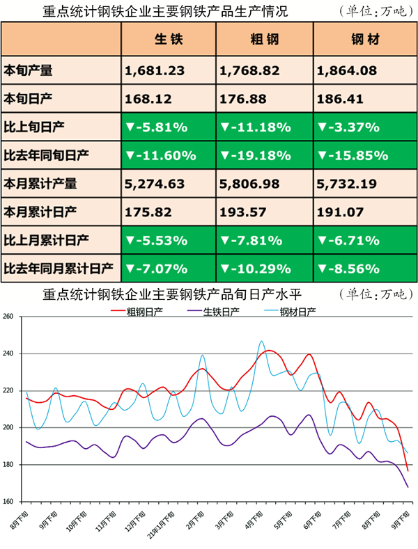 據9月下旬旬報統計,9月份,重點統計鋼鐵企業累計日產粗鋼193.57萬噸,環比下降7.81%,同比下降10.29%;生鐵日產175.82萬噸,環比下降5.53%,同比下降7.07%;鋼材日產191.07萬噸,環比下降6.71%,同比下降8.56%。