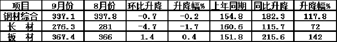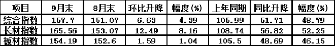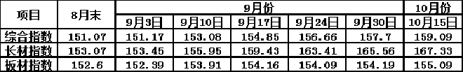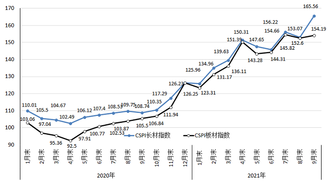 9月末,CSPI長材指數(shù)為165.56點,環(huán)比上升12.49點,升幅為8.16%;CSPI板材指數(shù)為154.19點,環(huán)比上升1.59點,升幅為1.04%;長材價格升幅比板材高7.12個百分點。與上年同期相比,長材、板材指數(shù)分別上升56.82點和48.69點,升幅分別為52.25%和46.15%。(見下圖、表)